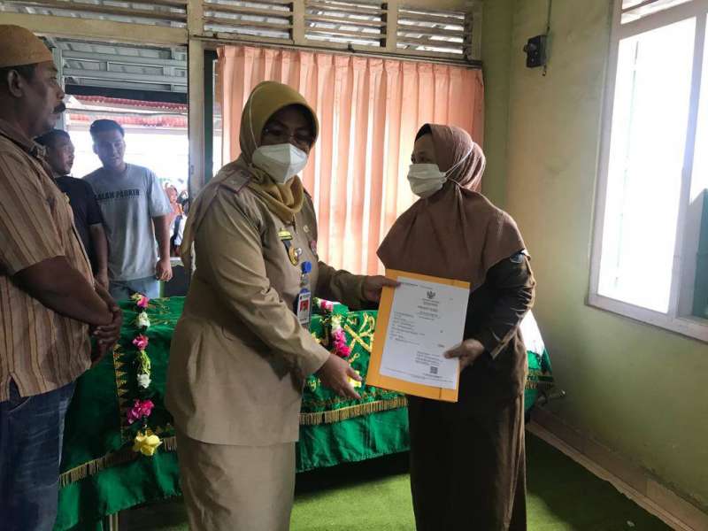 Penyerahan Akta Kematian almarhumah Tursinah oleh Kepala Disdukcapil Kota Metro Dra. Maria Fitri Jayasinga, M.Pd kepada ahli waris Rumiati (Administrator Database Kependudukan Disdukcapil) di Kelurahan Metro, Kecamatan Metro Pusat.